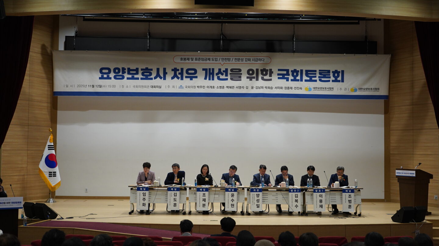 11월 12일(수) 15:00 국회의원회관 대회의실에서 국회의원 박주민·이개호·소병훈·백혜련·서영석·김윤·김남희·박희승·서미화·장종태·전진숙, 대한요양보호사협회가 주최하고, 대한요양보호사협회가 주관한 ‘요양보호사 처우 개선을 위한 국회토론회’가 있었다. 이날 토론회에는 엄청난 인파가 몰려 많은 사람들이 대회의실에 입장하지 못하고 발길을 돌리는 진풍경이 빚어졌다. 대한요양보호사협회 관계자에 의하면 자료집을 800부 제작했는데 순식간에 동이 났고, 1천여 명이 이날 참석한 것으로 확인했다. 또한, 이날 김문수 국회의원, 민형배 국회의원, 서영교 국회의원, 이언주 국회의원, 전현희 국회의원, 정준호 국회의원이 참석했다.