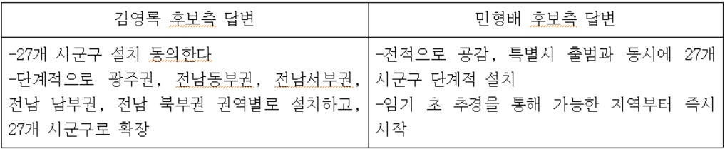 본 행사는 300여 명이 참가한 가운데 성황리에 진행되었습니다. 정책제안서는 사전에 두 후보에게 제안하였고, 두 후보가 참석하여 답변할 예정이었으나 갑작스럽게 정청래 대표가 전남을 방문함에 따라 캠프 관계자가 참석하여 답변하는 형식으로 진행되었습니다. 김영록 후보를 대신해서 이병훈 총괄상임선대위원장이, 민형배 후보를 대신해서 김승휘 상임선대위원장이 답변하였으며, 제안 내용과 답변은 다음과 같습니다.