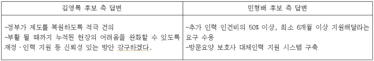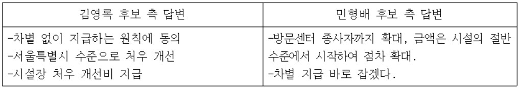 ※ 본 답변에서 김영록 캠프에서는 질문 요지와 다르게 답변하였습니다. 서울시가 2025년도에 지출한 처우 개선비는 시설의 일부 종사자를 대상으로 16억 7,200만 원에 불과합니다. 주관 단체가 정책 제안서에서 밝힌 광주광역시의 2025년도 예산은 24억 7,100만원, 전남은 37억 5,600만원으로 서울시의 예산이 턱없이 부족한 데 서울시 수준으로 개선하겠다고 답변한 것입니다.