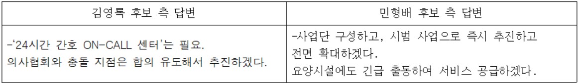 임종을 앞둔 전남광주특별시민에게 방문간호센터를 활용하여 ‘24시간 간호 ON-CALL’ 사업을 시범사업으로 추진할 것을 제안합니다. 구체적 추진 절차는 [24시간 간호 ON-CALL 추진 사업단]을 설치하고, 그 사업단에 (사)대한간호협회 방문재택간호사회 광주·전남지부가 참여를 보장할 것을 제안합니다.